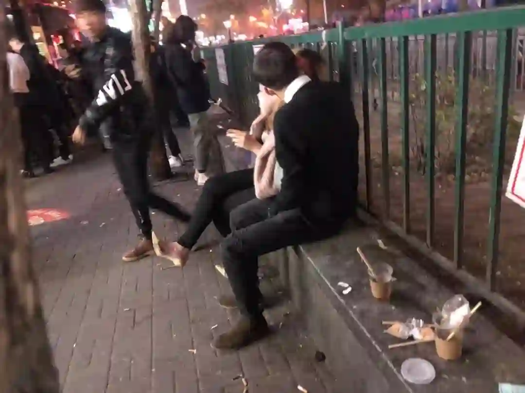 借着酒精和醉意,路边的的青年男女开始聊天。不时地交换微信、拥抱,甚至亲吻起来。