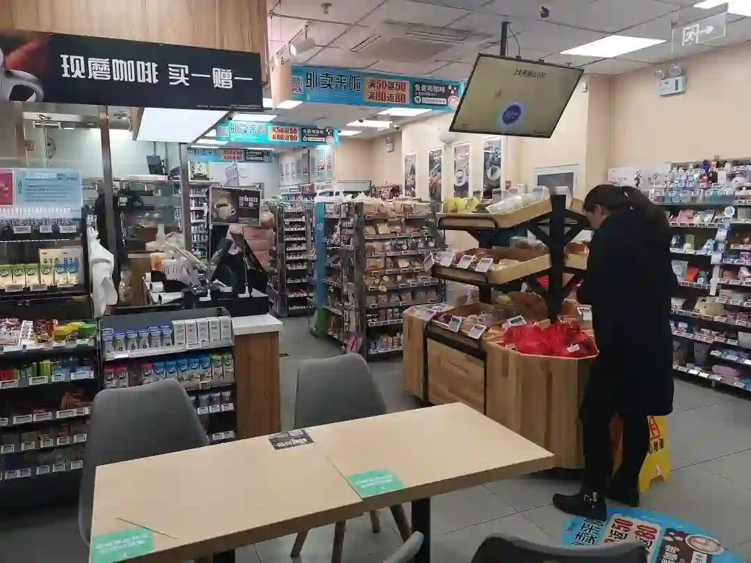 她今天在建外SOHO有场面试,不知道附近有什么可吃的,看到这个便利店有卡座就直接进来了。
