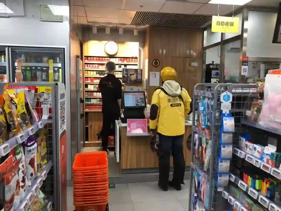 这个时间段,不像白天那么忙碌的外卖小哥,也会在等待订单的间隙,走进便利店买东西。