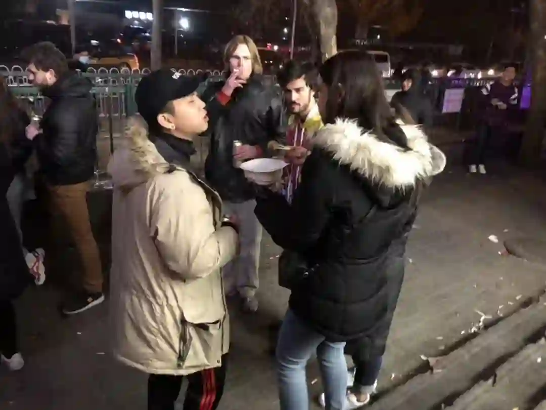 凌晨的五道口,气温已降至-1℃,便利店门口迎来了一群自带音响、载歌载舞的外国友人。舞至兴起,还有人脱下身上的外套,露出内里的背心。