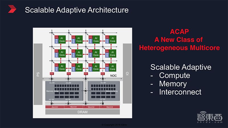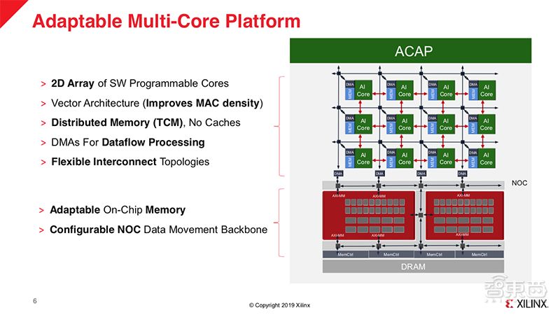 上图是赛灵思ACAP的架构示意图。从图中我们可以看到,它是由多个可编程核心组成的2D Mesh网络,每个可编程核心中都包含了AI主核、本地存储、DMA,并通过片上网络(NoC)实现互连。
