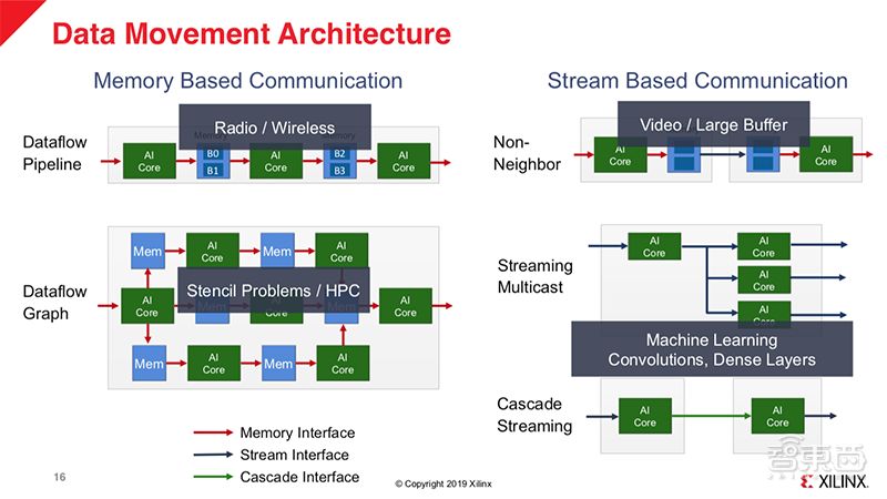传统多核架构是基于Cache的,而在演讲中,Ralph Wittig强调了ACAP中基于RAM的优势,通过这种分布式存储(Distributed Memory)的设计,数据能够通过不同路径,灵活、快速地进行搬运,极大地提高效率。