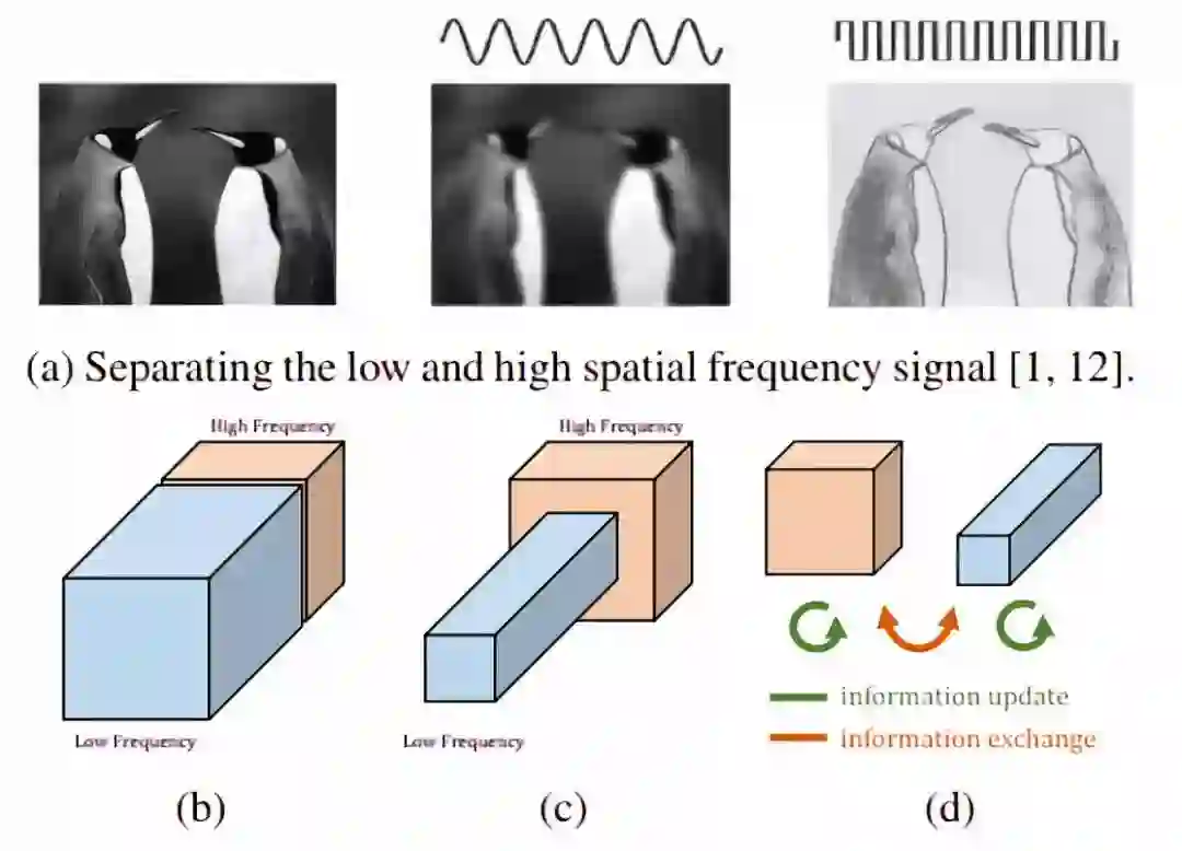 具体解释为:如图 2(a) 所示,自然图像可以分解为描述平稳变化结构的低空间频率分量和描述快速变化的精细细节的高空间频率分量。类似地,我们认为卷积层的输出特征映射也可以分解为不同空间频率的特征,并提出了一种新的多频特征表示方法,将高频和低频特征映射存储到不同的组中,如图 2(b) 所示。因此,通过相邻位置间的信息共享,可以安全地降低低频组的空间分辨率,减少空间冗余,如图 2(c) 所示。