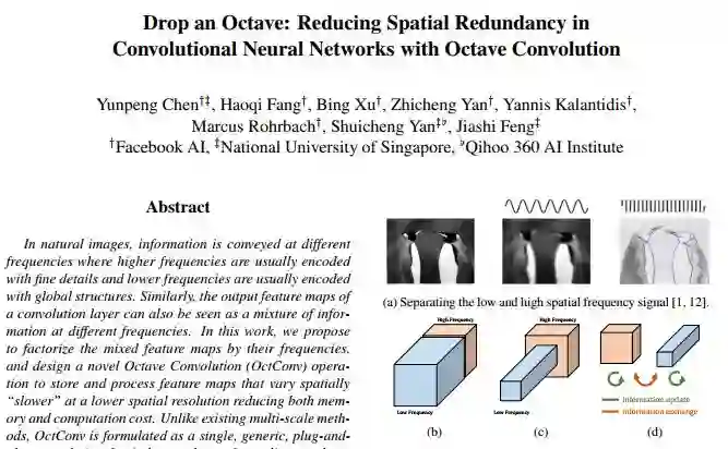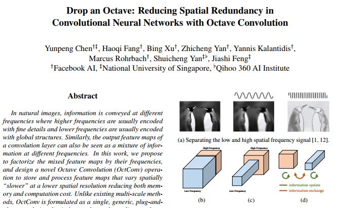 文章摘要(Abstract)部分指出,在自然图像中,信息以不同的频率传输,其中高频率通常以细节进行编码,而较低频率通常以总体结构进行编码,同理卷积层的输出可以看做不同频率的信息混合,在论文中,研究者提出通过频率对特征融合图进行分解,并设计出了一种新的Octave卷积(OctConv)操作,旨在存储和处理在空间上变化缓慢的较低分辨率的特征图,从而降低内存和计算成本。与现存的多尺度方法不同,OctConv是一种单一、通用、即插即用的卷积单元,可以直接代替普通卷积,而无需调整网络结构。