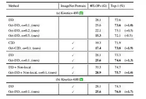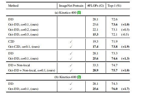 论文的实验部分:研究人员验证了提出的Octave卷积对于2D和3D网络的效能和效率,首先展示了ImageNet图像分类的控制变量研究,然后将其与当前最优的方法进行了比较。之后研究人员使用Kinetics-400和Kinetics-600数据集,展示了提出的OctConv也适用于3D CNN。