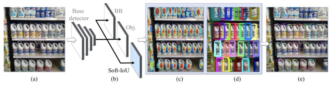 图 2.1:检测系统图示。(a)输入图像;(b)基础网络,带有边界框(BB)和 objectness (Obj.) heads,以及 Soft-IoU 层;(c)利用 EM 算法(EM-Merge)将 Soft-IoU 转换为 Gaussian heat-map;(d)被多个重叠边界框检测到的对象;(e)合并重叠检测。