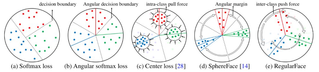 可以看到,Softmax loss 仅学习可分离的决策边界;Angular softmax loss 和 Softmax loss 本质上是等价的,但学习的是角度可分离的决策边界; Center loss 将属于同一类的特征表示「拉」到其中心,以便获得紧凑和有辨别力的表示;SphereFace 将数据点的外边界「推远」; RegularFace 将数据点的中心「推远」。