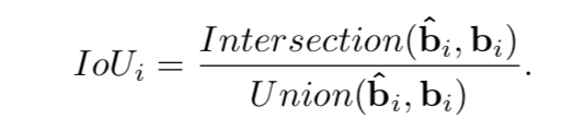 IoU,即 Jaccard index,用于衡量回归检测框和对象位置的重合程度,在目标检测中十分常见。这里笔者仅简单给出文中的定义——给定 N 个预测,预测的边界框$b_i$,i∈{1..N} 与实际边界框$\hat{b_i}$之间的 IoU 定义为: