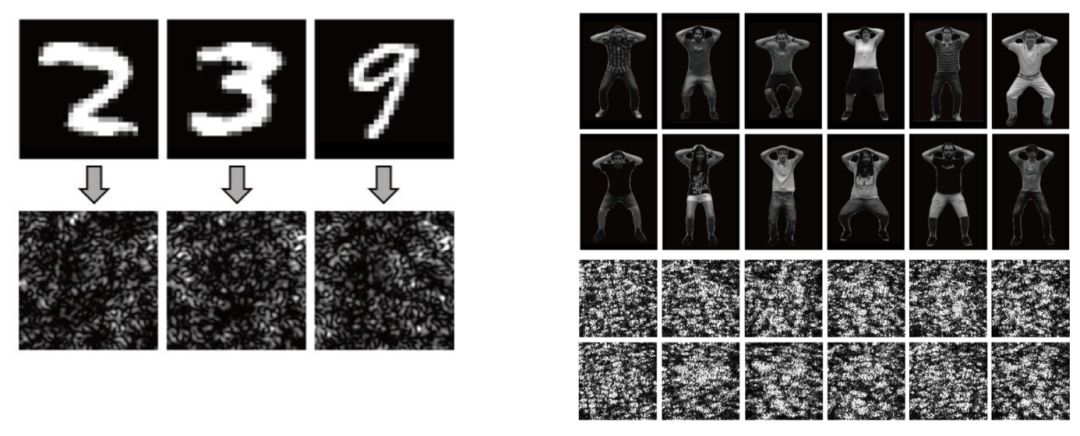 图 1.1: 左:手写数字的散斑图案模拟;右:人体姿势的散斑图案模拟
