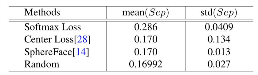 其中$\phi_{i,j}$是 W_i 和_Wj 之间的角度。理想情况下,聚类中心应该是均匀分布的,并且尽可能远离其他聚类中心,因此,cos 值应当较小。换句话说,Sep 的平均值和标准差应该尽可能小。下表列出了用不同损失函数训练的模型的定量比较。模型使用的网络和数据集都是一样的。