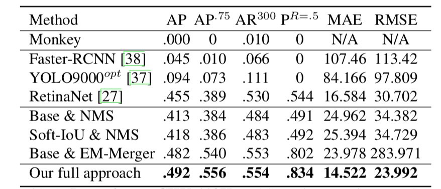文章所提出的方法相较 faster-rcnn 和 yolo9000 在运行速度上仍然有明显的差距,不过其检测精度大大优于后两个网络。模型的 precision 和 recall 并没有比 RetinaNet 高很多,但 MAE 和 RMSE 小了很多,说明模型预测的每一个检测框几乎都更准确的检测到了目标(RetinaNet 有很多多余的检测框),在其后报告的计数任务上的表现也证明了模型在这方面的能力。