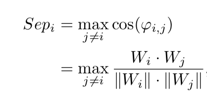 为了证明这一观点,作者使用将特征映射到标签置信度的分类矩阵 W ∈ R^{K×C} 来定量评估类间可分性。W_i 是 W 的第 i 列,其表示第 i 个标签类的权重向量,K 是特征向量的维度。则类间可分性可以定义为:
