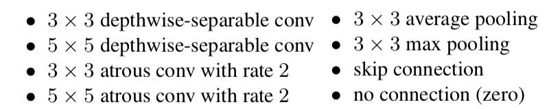 单元 l 中的模块 i 的输入张量 I_i^l 的集合包括前一个单元 H^{l-1} 的输出,前前一个单元 H^{l-2} 的输出,以及当前单元中的此前的模块的输出 {H_1^l, ..., H_i^l}。因此,随着模块的增加,下一个模块的输入张量集合会不断增加。作者定义了 8 个常见的运算符组成可能的层类型集合 O: