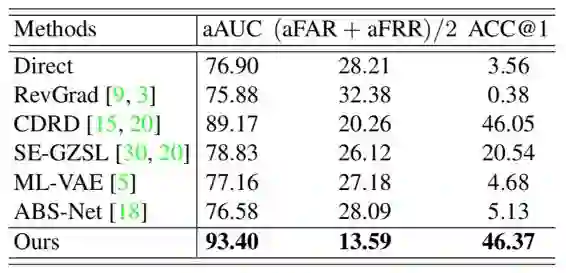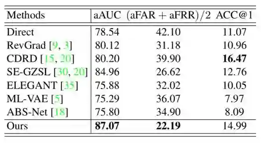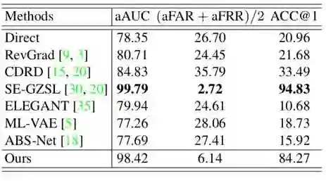 在CelebA数据集、移动手机数据集上,我们的aAUC和(aFAR+aFRR)/2指标都显著优于对比方法。