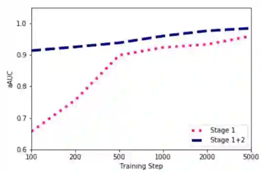 图 7 加性对抗学习的提升效果。横轴每个值代表阶段1的模型在每个迭代步数时停下来输出模型给阶段2。红色代表阶段1模型的性能,蓝色代表经过加性对抗网络提升后的模型性能。