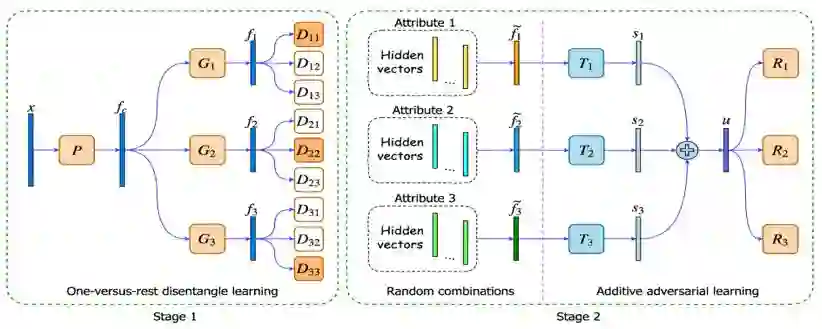 在第一个阶段中,我们提出一对多的解耦学习(one-versus-restdisentangle learning , OVRDL)机制来将每个样本映射到多个隐层空间。在每个隐层空间里,我们将一个属性与其他属性解耦。在第二阶段中,由于训练数据中仅见过有限的属性值的组合,我们采用了一种数据增广的方法来随机组合属性标签,以及拼接其对应的隐层特征向量来作为一个新的数据样本。