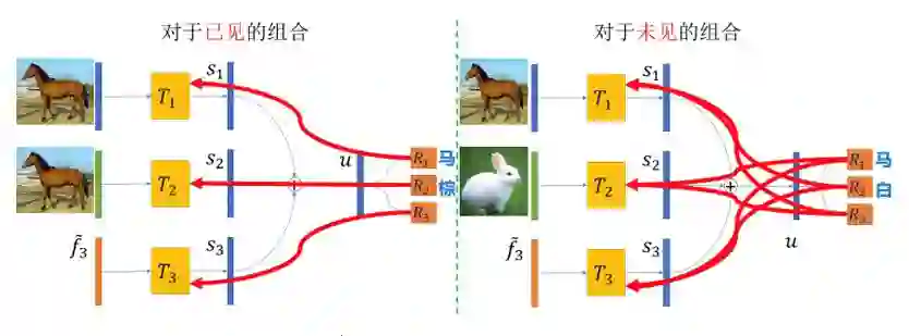 首先,假设对于见过的属性组合已经学好了,例如,一匹棕色的马可以被精确地识别为物体“马”和颜色“棕”。之后,对于没见过的属性组合,一匹棕色的马和一只白色的兔子,我们要让网络输出物体“马”和颜色“白”。