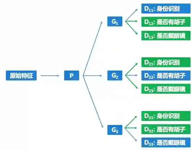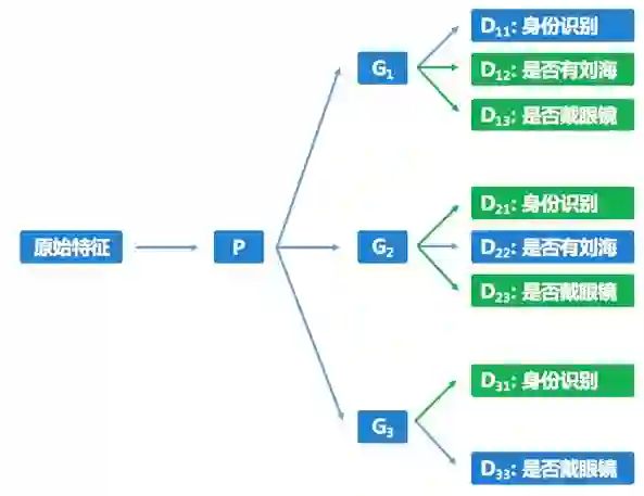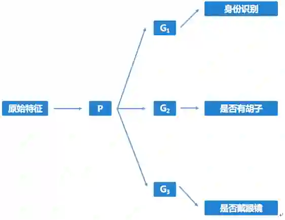 图 2:“假设独立”的学习框架。G网络均为特征变换网络。身份识别、是否有胡子、是否戴眼镜为三个属性,分别建模为三个任务进行学习。不同G网络输出的特征假设相互独立。
