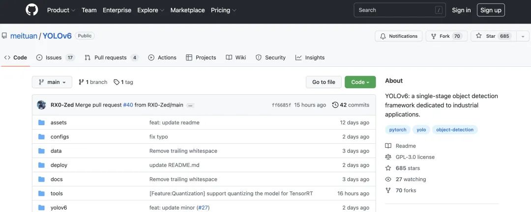 YOLOv6 是美团视觉智能部研发的一款目标检测框架,致力于工业应用。本框架同时专注于检测的精度和推理效率,在工业界常用的尺寸模型中:YOLOv6-nano 在 COCO 上精度可达 35.0% AP,在 T4 上推理速度可达 1242 FPS;YOLOv6-s 在 COCO 上精度可达 43.1% AP,在 T4 上推理速度可达 520 FPS。在部署方面,YOLOv6 支持 GPU(TensorRT)、CPU(OPENVINO)、ARM(MNN、TNN、NCNN)等不同平台的部署,极大地简化工程部署时的适配工作。目前,项目已开源至 Github,欢迎有需要的小伙伴们 Star 收藏,随时取用。