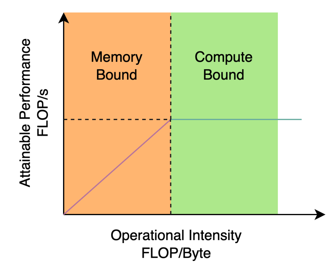 YOLOv5/YOLOX 使用的 Backbone 和 Neck 都基于 CSPNet[5] 搭建,采用了多分支的方式和残差结构。对于 GPU 等硬件来说,这种结构会一定程度上增加延时,同时减小内存带宽利用率。下图 2 为计算机体系结构领域中的 Roofline Model[8] 介绍图,显示了硬件中计算能力和内存带宽之间的关联关系。