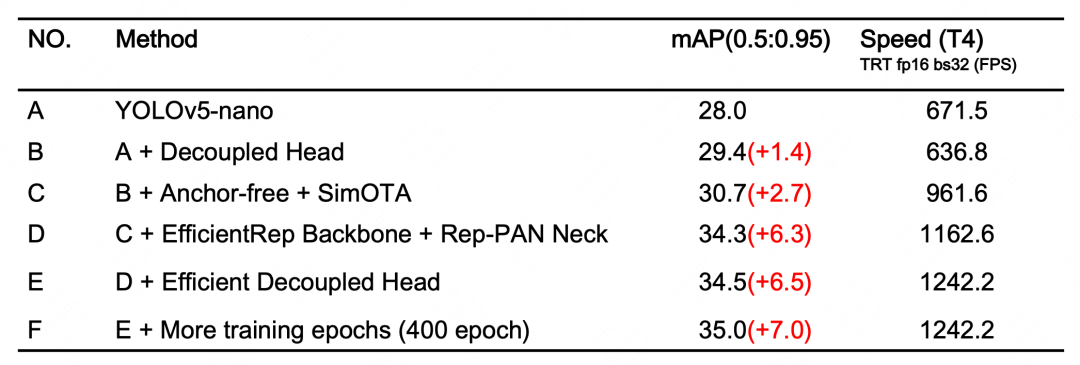 经过以上优化策略和改进,YOLOv6 在多个不同尺寸下的模型均取得了卓越的表现。下表 1 展示了 YOLOv6-nano 的消融实验结果,从实验结果可以看出,我们自主设计的检测网络在精度和速度上都带来了很大的增益。