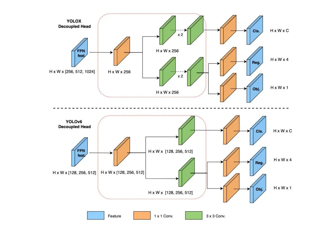 在 YOLOv6 中,我们采用了解耦检测头(Decoupled Head)结构,并对其进行了精简设计。原始 YOLOv5 的检测头是通过分类和回归分支融合共享的方式来实现的,而 YOLOX 的检测头则是将分类和回归分支进行解耦,同时新增了两个额外的 3x3 的卷积层,虽然提升了检测精度,但一定程度上增加了网络延时。因此,我们对解耦头进行了精简设计,同时综合考虑到相关算子表征能力和硬件上计算开销这两者的平衡,采用 Hybrid Channels 策略重新设计了一个更高效的解耦头结构,在维持精度的同时降低了延时,缓解了解耦头中 3x3 卷积带来的额外延时开销。通过在 nano 尺寸模型上进行消融实验,对比相同通道数的解耦头结构,精度提升 0.2% AP 的同时,速度提升 6.8%。