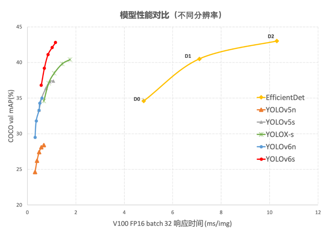 图 1-2 YOLOv6 与其他模型在不同分辨率下性能对比