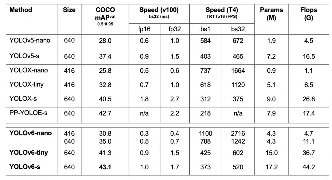 表 2 YOLOv6 各尺寸模型性能与其他模型的比较