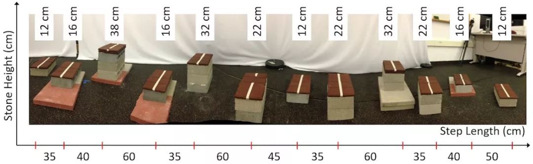 团队通过ATRIAS双足机器人平台上对控制算法进行了实验测试,它能够在随机变化的离散地形上实现动态步行,步长在30到65厘米之间变化,步高需要向上/向下22厘米,同时保持0.6米/秒的平均步行速度。