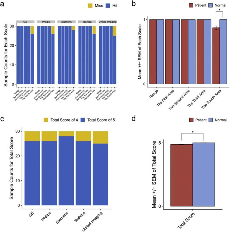 我们利用五点量表(表2)来评估IILS的质量。在所有类型的制造商中,只有少数几个分数无法达到第四等级(图12a)。正常布局情况下没有发现遗漏,然而,与正常对照组相比(p=0.04)(图12b),患者在第四区的几个病例中出现了漏诊。我们还比较了从每个量表得分中得出的总分,总的来说,西门子在使用IILS时效果最好。总分显示,与结节患者相比,IILS更适合无结节者(p=0.04)(图12d)。