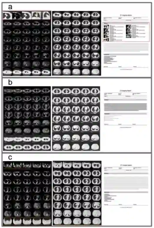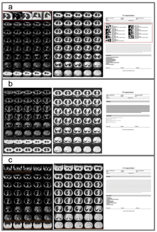 我们还推断一个好的排版系统主要包括以下三个主要内容:1)任何可靠,客观的测量数据的所有关键图像; 2)显示肿瘤特征的一系列图像,包括形状,数量,密度,大小,增强,多角度观察和后续比较; 3)胸部纵隔窗和肺窗图像连续显示(图5a-b)。此外,我们手工显示当前排版形式的图片,这在日常工作中作为比较非常普遍(图5c)。
