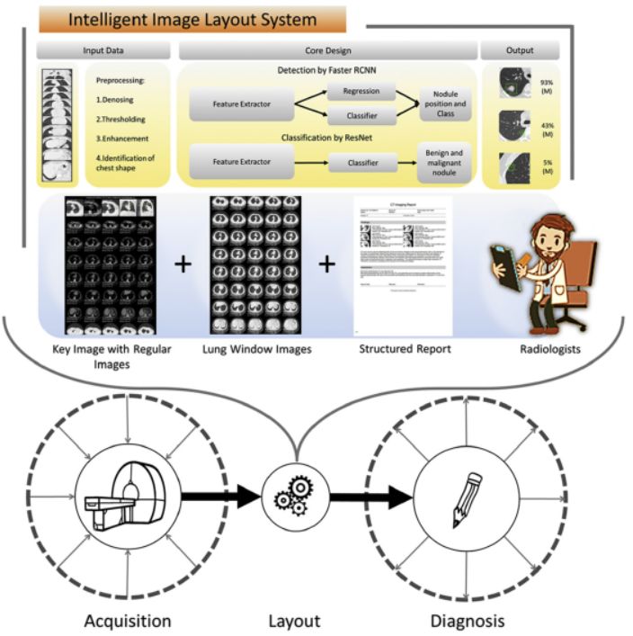 该团队选择了一个全新的切入点——从临床影像工作全流程角度出发,提出了一种基于深度学习的智能成像排版系统(IILS),系统包括AI肺结节检测和分类和自适应排版工具,用于结节识别的成像报告标准化和工作流程优化。