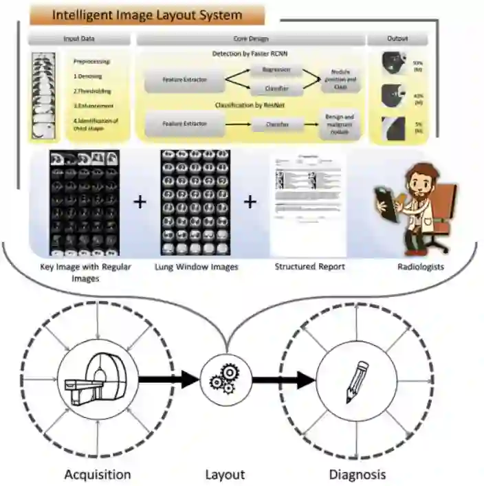 临床任务的一个典型例子是,分类并生成与肺结节的诊断密切相关的胸部CT图像的布局。在筛查检测和随访期间,目前的日常工作流程中仍存在五个问题。