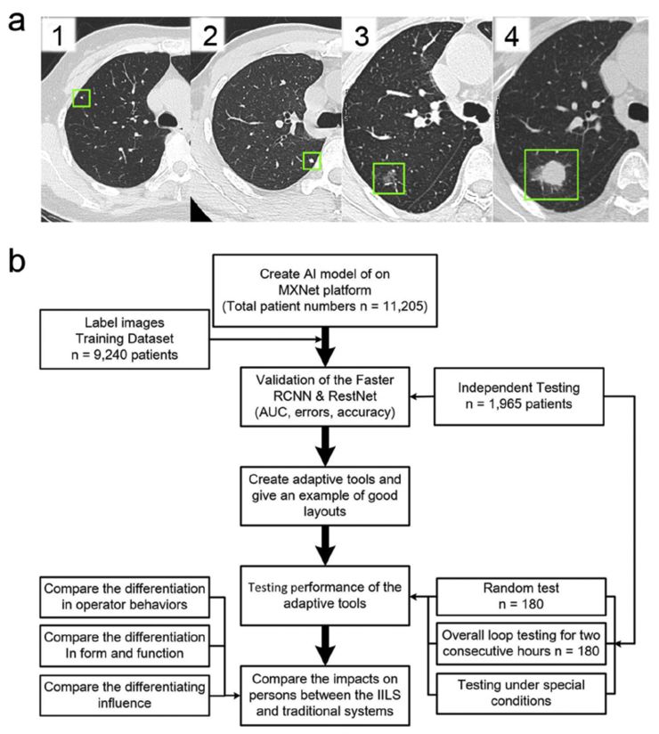 图6:应用人工智能技术对不同大小肺结节的检测过程进行了演示,并给出了整个实验设计的流程图。