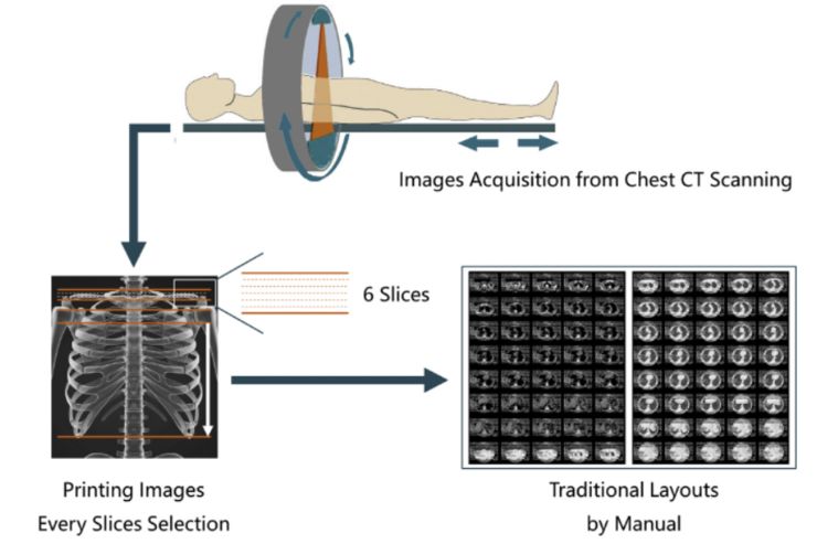 图2.当前的手工选片过程和日常工作中的相关问题。例如,成人的典型胸部CT扫描有大约三百张图像。然而,最终排版仅约为四十幅图像。因此,大约87.7%的图像被忽略了。相应报告不能与排版结果100%匹配,特别是当肺结节的直径小于1cm时。以GE的CT扫描方法为例,在日常工作中使用手动图像排版时,通常会忽略6(层)×1·25 mm(厚度)= 7·5 mm范围内的肺组织。因此,当医生获得最终的图像时会遇到以下问题:缺乏成像报告标准化、缺失结节、缺乏关键图像以及缺乏对临床医生和患者需求的考虑。