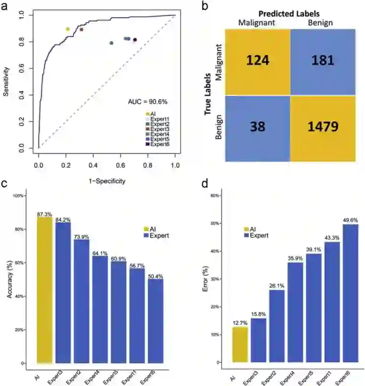 使用284例病理结果患者的独立数据进行比较,使用相同的数据集比较恶性肺结节和良性结节,以确定模型性能的准确性。我们推断,我们最初的预测模型完全适用于临床,因为其ROC下面积对于恶性肺结节相对于良性肺结节高达90.6%(图11a)。在0.5的评分截断下,124例预测为真阳性,1479例为真阴性。约有38例被标记为假阳性,181例为假阴性。敏感性76.5%,特异性89.1%(图11b)。在另一组284例病理金标准患者中,模型和人类专家的预测性能在曲线上进行了比较,得出结论:人工智能在敏感性和特异性方面优于其他6名专家。此外,与人类专家相比,人工智能显示出最高的准确性;正确预测248例(87.3%,预测为真阳性或真阴性的人数除以284),错误预测最少,36例(12.7%)。