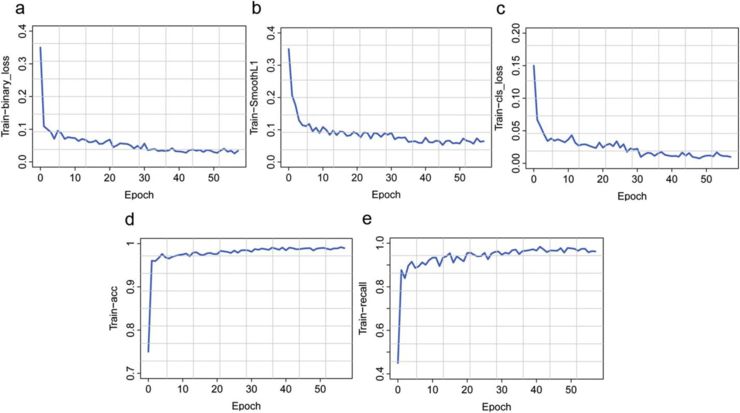 IILS系统的核心设计是深度学习模型,该模型分为两个部分,Faster RCNN和ResNet。Faster RCNN主要负责肺结节的检测和定位。Faster RCNN 还有助于将肺结节分为以下几类:0-3 mm、3-6mm、6-0mm、10-30mm肺结节,实性结节、钙化结节和磨砂玻璃结节(GGNs)。第二部分是ResNet,主要负责肺结节良恶性的分类。在第一部分中,关于特征提取,我们使用了ResNet-50 中的层conv4_x作为输出。在我们的尝试中,ResNet-50中的层conv4_x在检测中表现出最佳性能。在区域建议网络(RPN)中,采用二元交叉熵作为分类损失函数,选取smooth L1损失函数作为回归损失函数。模型的训练过程完善,曲线均达到收敛。该模型的训练过程是完美的,所有曲线均达到收敛。RPN的训练过程如图7a-b所示,所有曲线收敛为零。这也表明我们的模型能够很好地区分前景和背景,并提供了一个精确的前景边界框。图7c曲线也收敛到零,该曲线的收敛性表明,该模型能够很好地区分7类肺结节。第二部分,我们用ResNet对结节良恶性进行了分类。为了获得更准确的模型并避免梯度分散等问题,我们选择了ResNet。在IILS系统中,ResNet显现出了优异的分类性能。曲线的收敛代表了我们分类工作的成功;在模型精度方面,训练和验证曲线均接近100%(训练过程为100%,验证过程为97%)。在损失函数部分,曲线也显示该模型在良恶性结节的分类上表现良好。