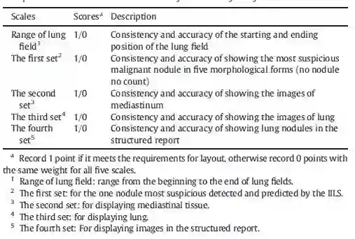 根据2018年NCCN指南的要求,我们与六位专家(三位放射科医生和三位临床医生)进行了讨论后,就良好的图像布局形式达成了最终共识。为了模拟医学成像部门胸部CT扫描后的日常工作结果,我们设计了一种自动自适应布局工具,可以生成“自动胶片布局和肺结节结构报告”,以连接到CNN网络的输出。自动自适应布局工具可以导出关键肺结节图像(具有增加的恶性风险的结节)的胶片布局并生成结构化报告。两种胶片布局都以固定格式使用(一部胶片上有5×8网格)。将180名患者的胸部CT图像混合并连续输入到IILS,以模拟来自不同制造商的图像在日常工作中进入工作站的情况。评估了自适应布局工具的特性以及是否可以成功布局。这180名患者的图像总数为60660,包括纵隔12240例窗口图像和48420张肺窗图像。使用5点量表方法来最终判断电子胶片的布局。