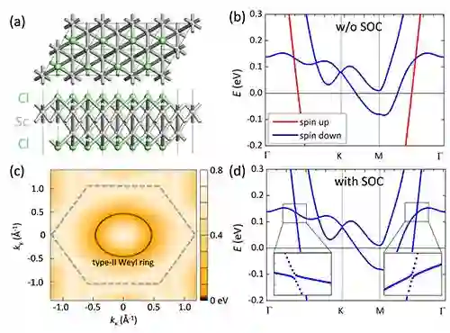 图 4. 铁磁性的单层ScCl中存在第二类外尔节点环费米子。