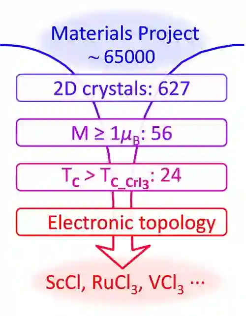 在二维层状材料中实现磁性是研究人员的重要目标,因为二维磁性材料既是构造自旋电子学器件的基础,又是研究新奇物理现象的平台。通常,人们通过掺杂磁性原子或利用界面近邻效应在非磁性材料中引入磁性,但是这些非本征的磁性易受到载流子浓度、杂质类型、界面原子结构等因素的影响。因此,人们希望实现具有本征磁性的二维层状材料。先前人们根据Mermin–Wagner定理,各向同性的单原子层二维材料由于长程热涨落并不能表现出宏观磁性,本征二维磁性材料被认为不能存在。最近的实验工作发现,范德瓦尔斯结合的层状材料CrI3和Cr2Ge2Te6具有低维长程磁序[Nature 546, 270 (2017), Nature 546, 265 (2017)],这些工作开创了本征二维磁性材料研究的新时代。目前已知的二维本征磁性材料很少,其较低的居里温度(<50 K)很难满足电子学器件的实用要求。比如量子反常霍尔效应只在极低温下的复杂磁性体系中实现,将这类拓扑态应用到实际体系的途径之一就是寻找新型二维磁性材料。而且,新材料体系的发现将可能揭示出新的拓扑电子态。