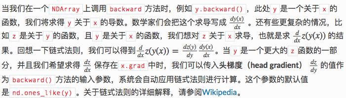 接下来我们可以通过z.backward()来进行求导。如果z不是一个标量,那么z.backward()等价于nd.sum(z).backward().