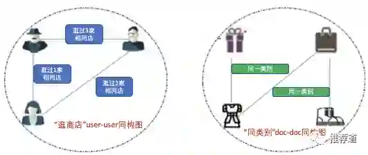 图上,存在多种节点(user和item)、多种关系(user之间逛过同一店铺、item之间属于同一品牌),因此属于异构信息网络,也即知识图谱。众所周知,处理异构图要比同构图更有难度。