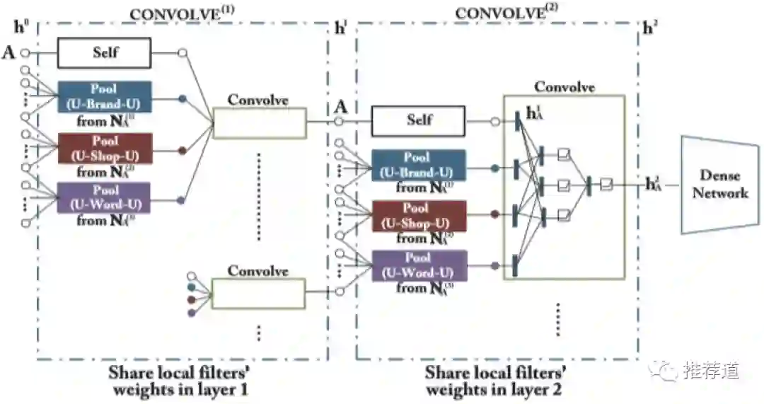 还要融合当前user在各种“关系”(e.g., 逛过同一店铺、喜欢同一品牌、使用过相同的搜索词)下的相邻user的特征。