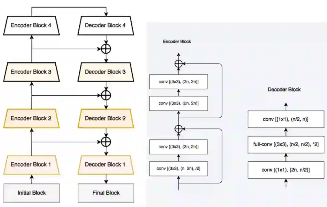 LinkNet 架构类似于一个梯形网络架构,编码器的特征图(横向)和解码器的上采样特征图(纵向)相加。还需要注意的是,由于它的通道约减方案(channel reduction scheme),解码器模块包含了相当少的参数。大小为 [H, W, n_channels] 的特征图先通过 1*1 卷积核得到大小为 [H, W, n_channels / 4] 的特征图,然后使用反卷积将其变为 [2*H, 2*W, n_channels / 4],最后使用 1*1 卷积使其大小变为 [2*H, 2*W, n_channels / 2],因此解码器有着更少的参数。这些网络在实现相当接近于最优准确率的同时,可以实时地在嵌入式 GPU 上进行分割。