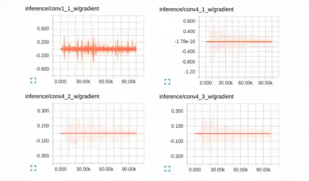 第一个卷积层捕捉低层次的几何信息,因为这完全依赖数据集,你可以注意到梯度调整了第一层的权重以使模型适应数据集。VGG 中更深层的卷积层有非常小的梯度流,因为这里捕获的高层次的语义概念足够用于分割。