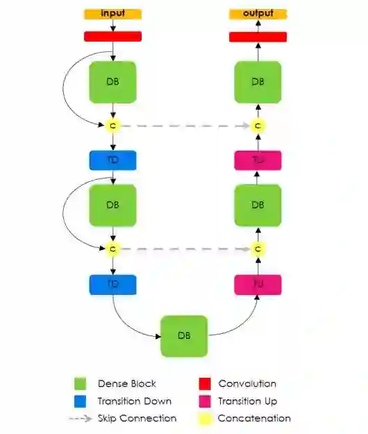 全卷积 DenseNet 使用 DenseNet 作为它的基础编码器,并且也以类似于 U-Net 的方式,在每一层级上将编码器和解码器进行拼接。