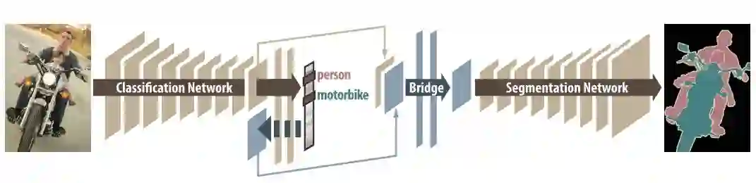 与现有的将语义分割作为基于区域分类的单一任务的方法相反,我们的算法将分类和分割分离,并为每个任务学习一个单独的网络。在这个架构中,通过分类网络识别与图像相关的标签,然后在分割网络中对每个识别的标签执行二进制分割。它通过利用从桥接层获得的特定类的激活图来有效地减少用于分割的搜索空间。