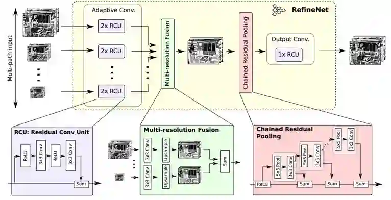 RefineNet 解决了传统卷积网络中空间分辨率减少的问题,与 PSPNet(使用计算成本高的空洞卷积)使用的方法非常不同。提出的架构迭代地池化特征,利用特殊的 RefineNet 模块增加不同的分辨率,并最终生成高分辨率的分割图。