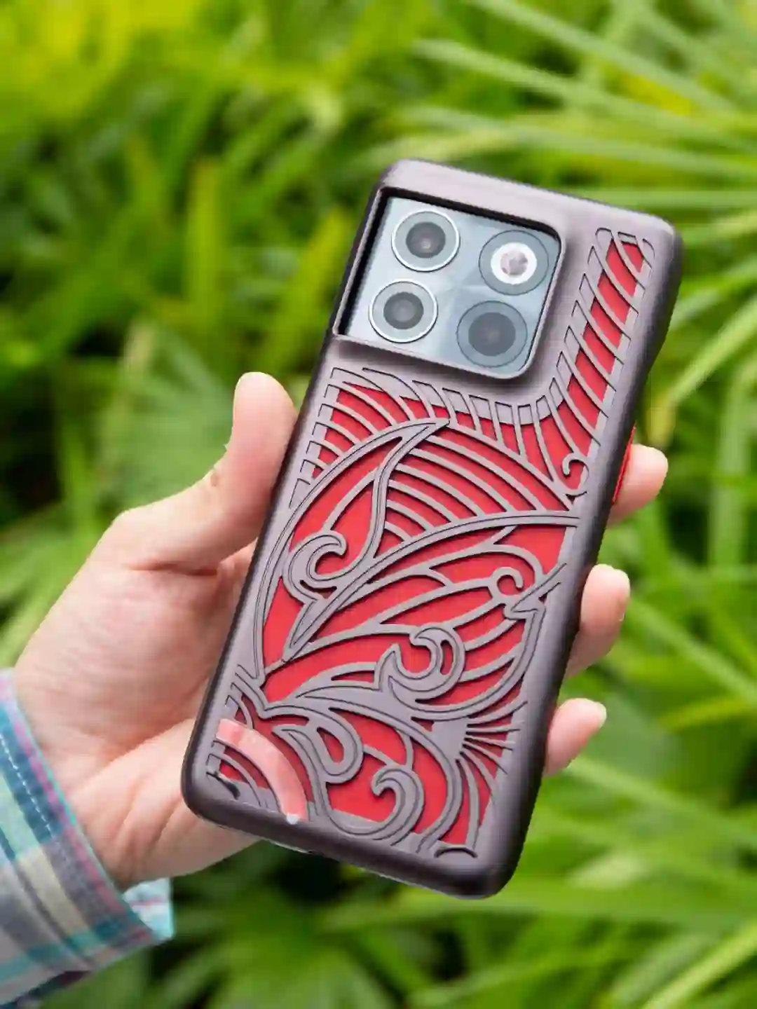 一加 Ace Pro 原神限定版深棕色的机身配色来源于胡桃标志性的“乾坤泰卦帽”。手机背面采用一体连续曲面玻璃与第三代丝绸玻璃工艺双工艺,配合一加还将背面的品牌 Logo 重新设计为“引蝶 Logo”,这也是一加首次在机身上对 Logo 进行重新设计。机身背面刻有胡桃立绘头像浮印,周围点缀着象征胡桃火元素属性的“烈焰纹理”。侧边键采用源自胡桃头饰的梅花红,闪光灯中心则融入了胡桃与众不同的“梅花瞳”。