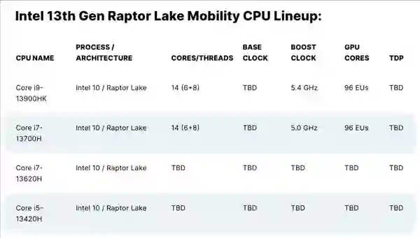 根据目前的曝光,英特尔 13 代酷睿移动处理器将会包括四款型号,包括 i9-13900HK、i7-13700H、i7-13620H 和 i5-13420H,其中 i9-13900HK 为首发的 13 代酷睿移动处理器。